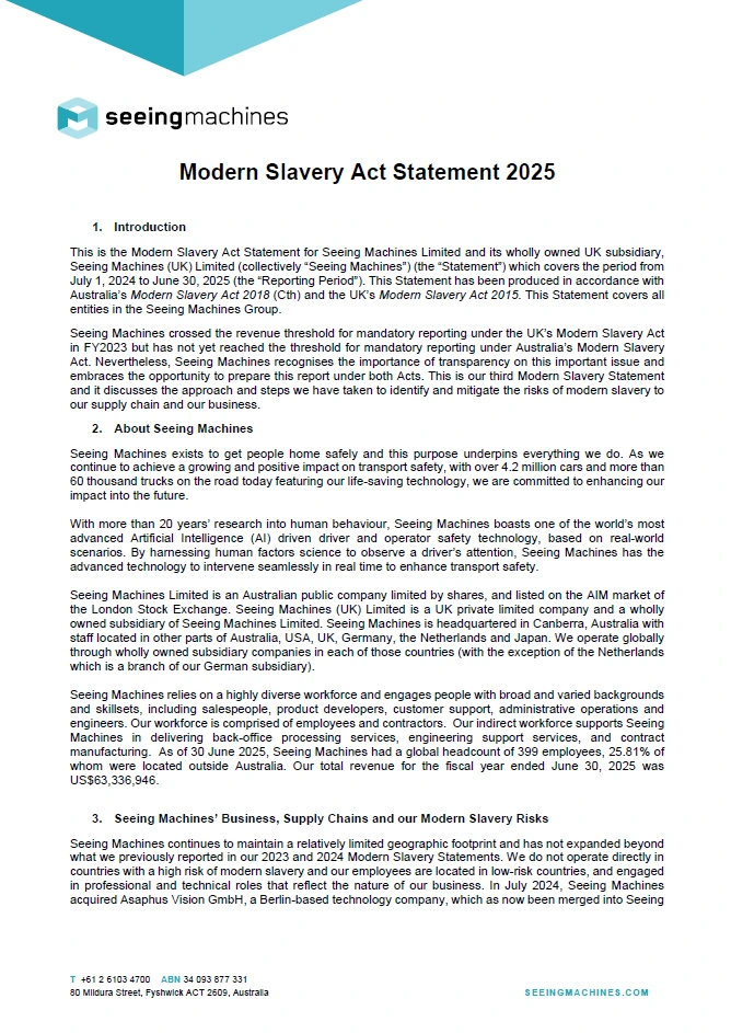 This is our second Modern Slavery Statement, which covers the period from 1 July 2023 to 30 June 2024 (FY 2024). Seeing Machines crossed the revenue threshold for mandatory reporting under the UK’s Modern Slavery Act but has not yet reached the threshold for mandatory reporting under Australia’s Modern Slavery Act. Nevertheless, Seeing Machines recognises the importance of transparency on this important issue and embraces the opportunity to prepare this report under both Acts. The Statement has been reviewed by the Attorney-General’s Department and is officially published on the Australian Government’s Modern Slavery Statements Register.